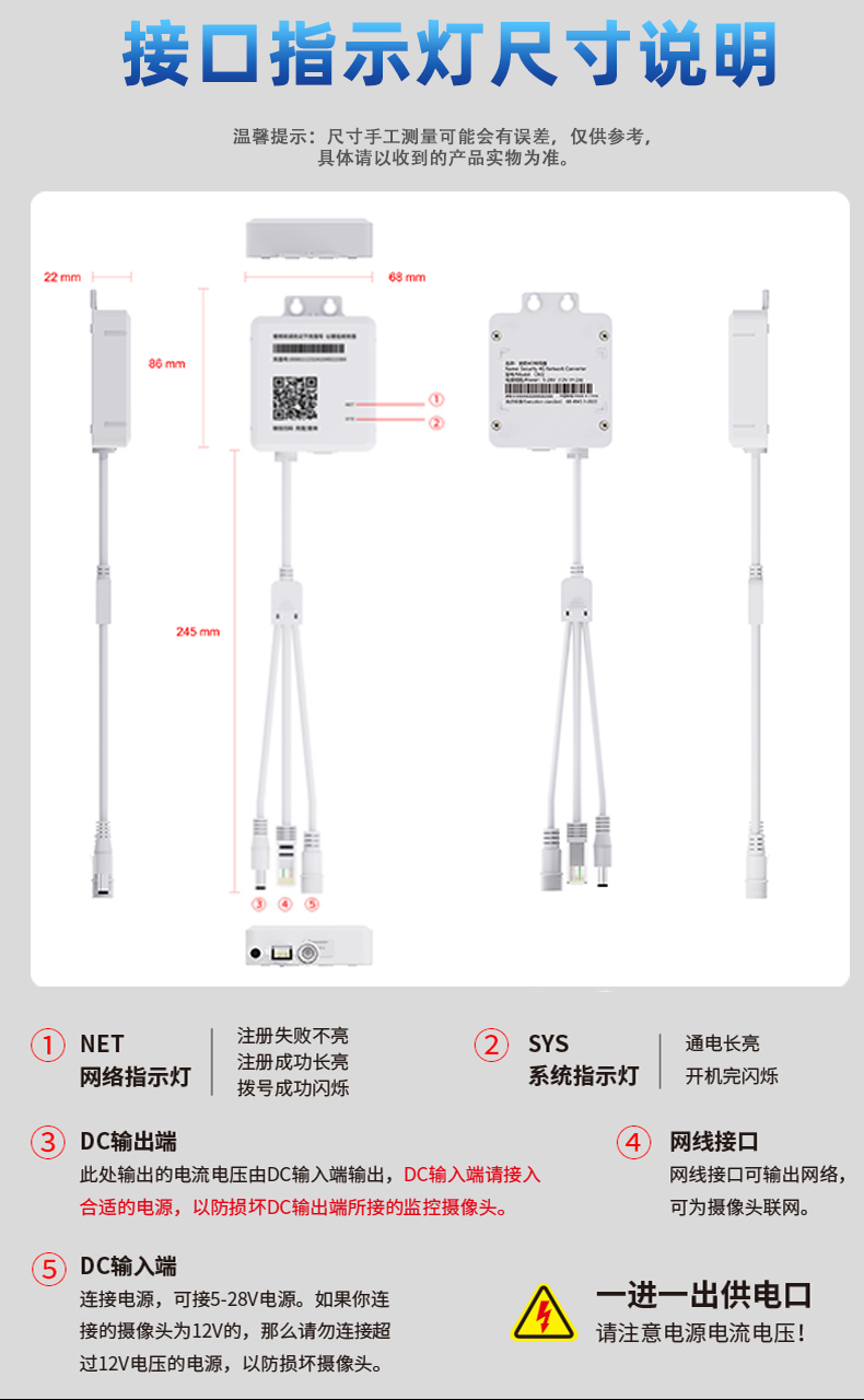 • 5-28V供电 一进一出供电口