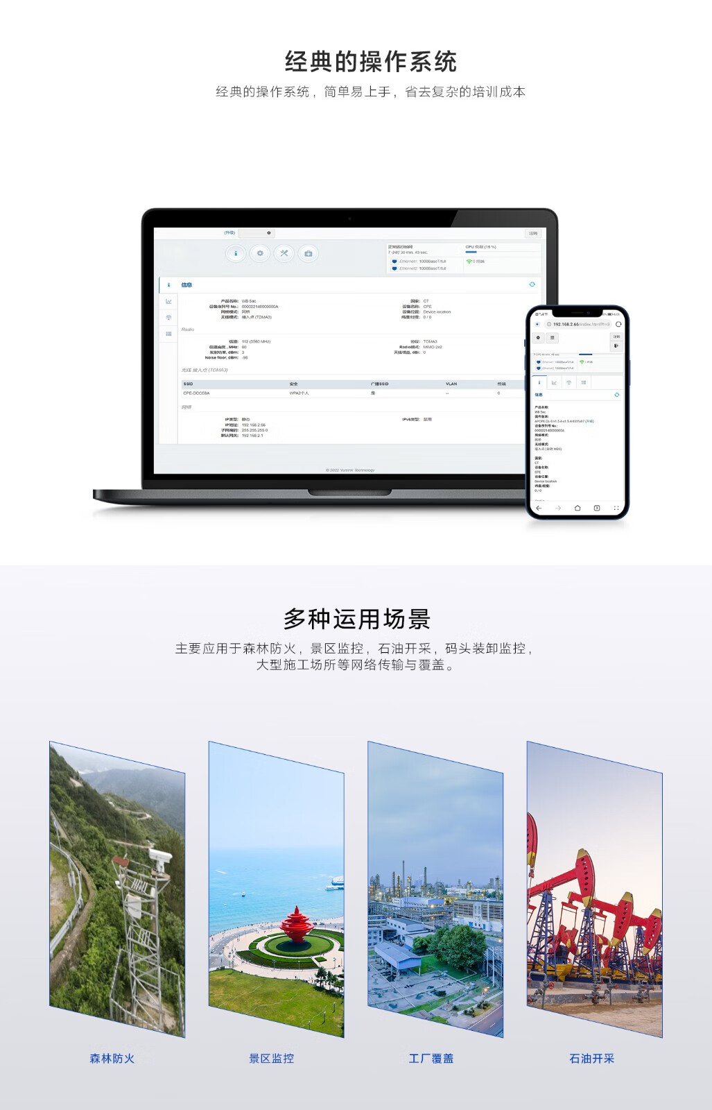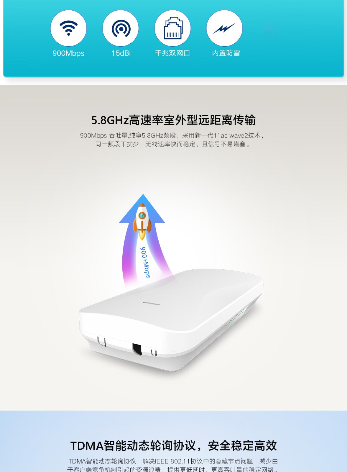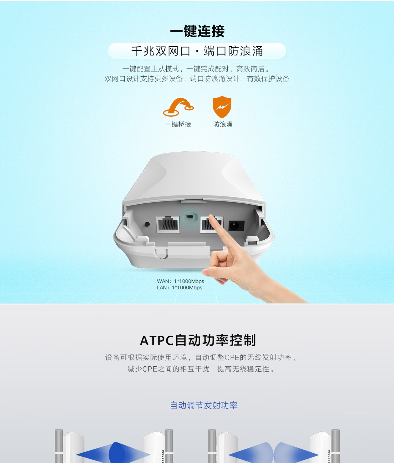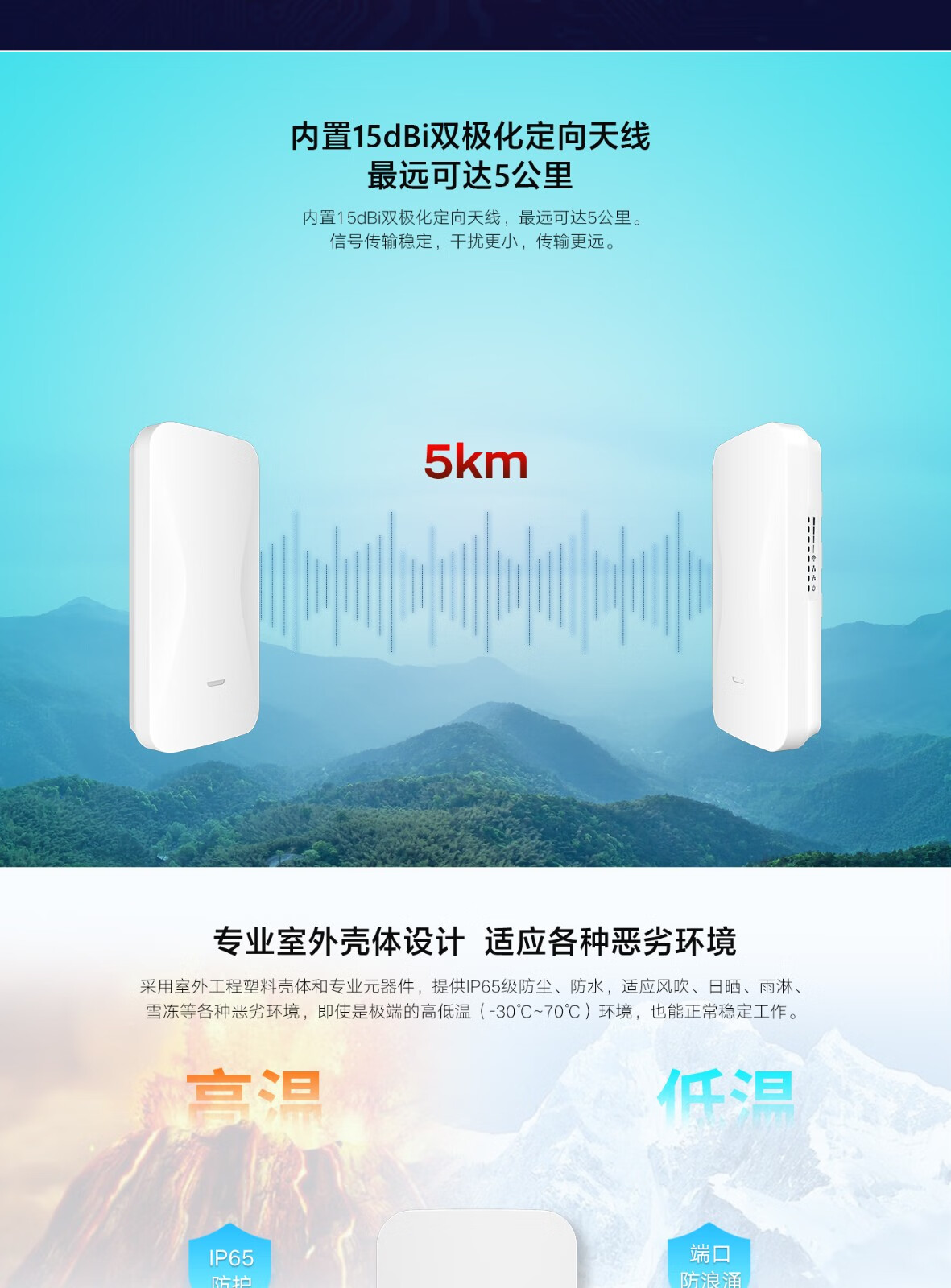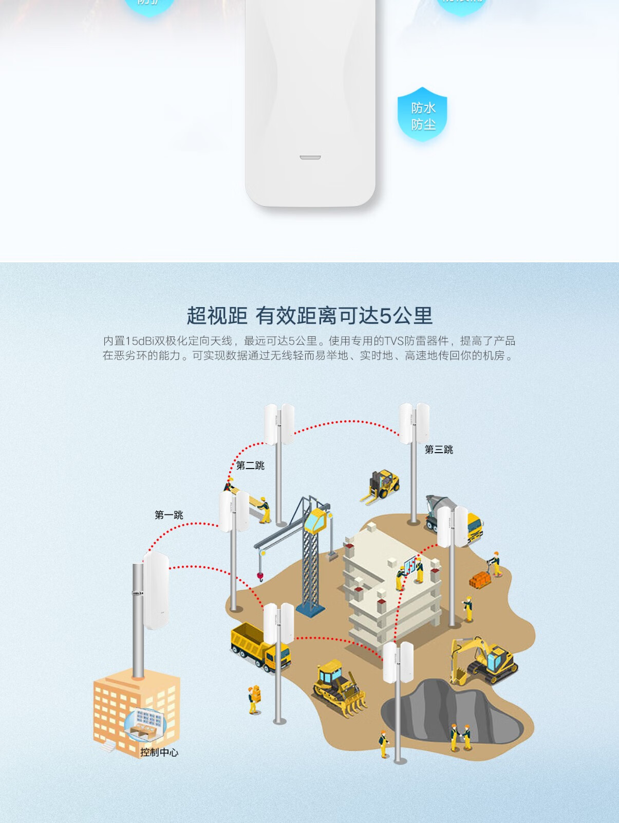 • 内置18dBi双极化定向天线,可达8公里。