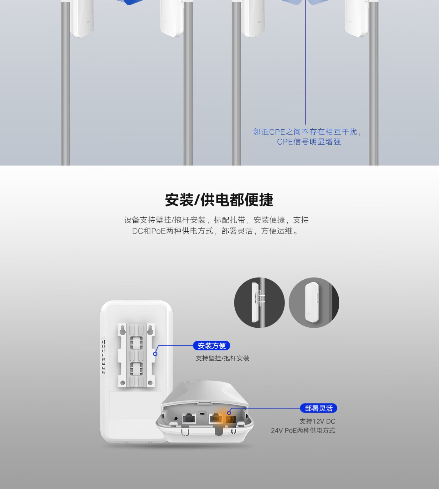 • 同时支持24~48V PoE供电和12V DC供电。
