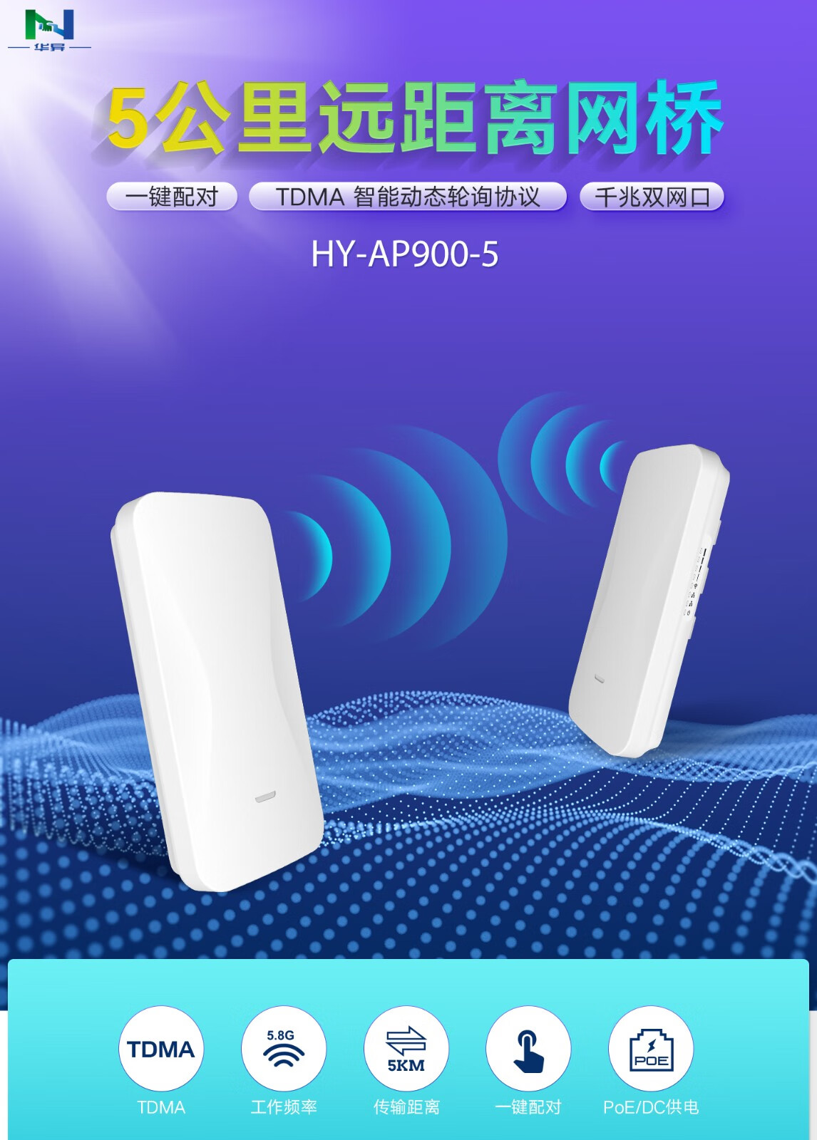 HY-AP900-5是一款高性能、高速率的室外远距离无线网桥,它具有传输距离远,穿透能力强,防干扰能力强等特点。