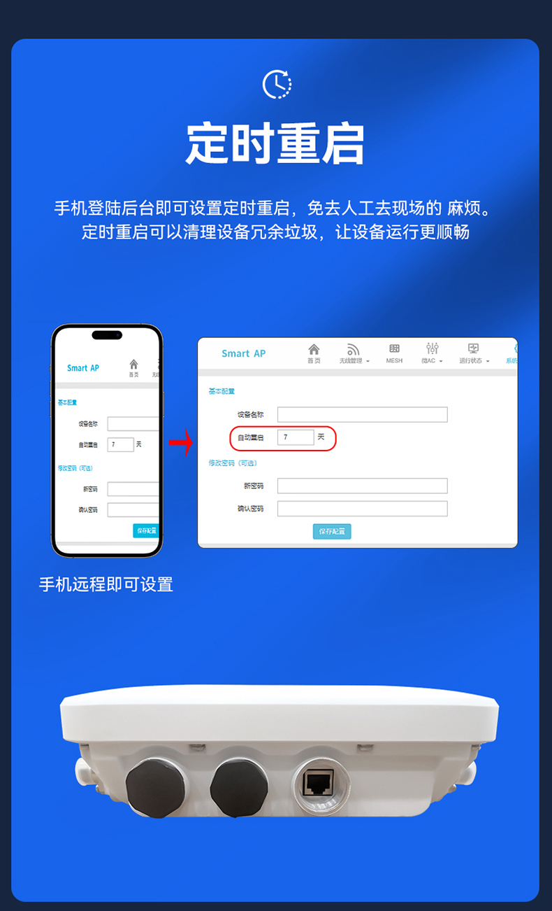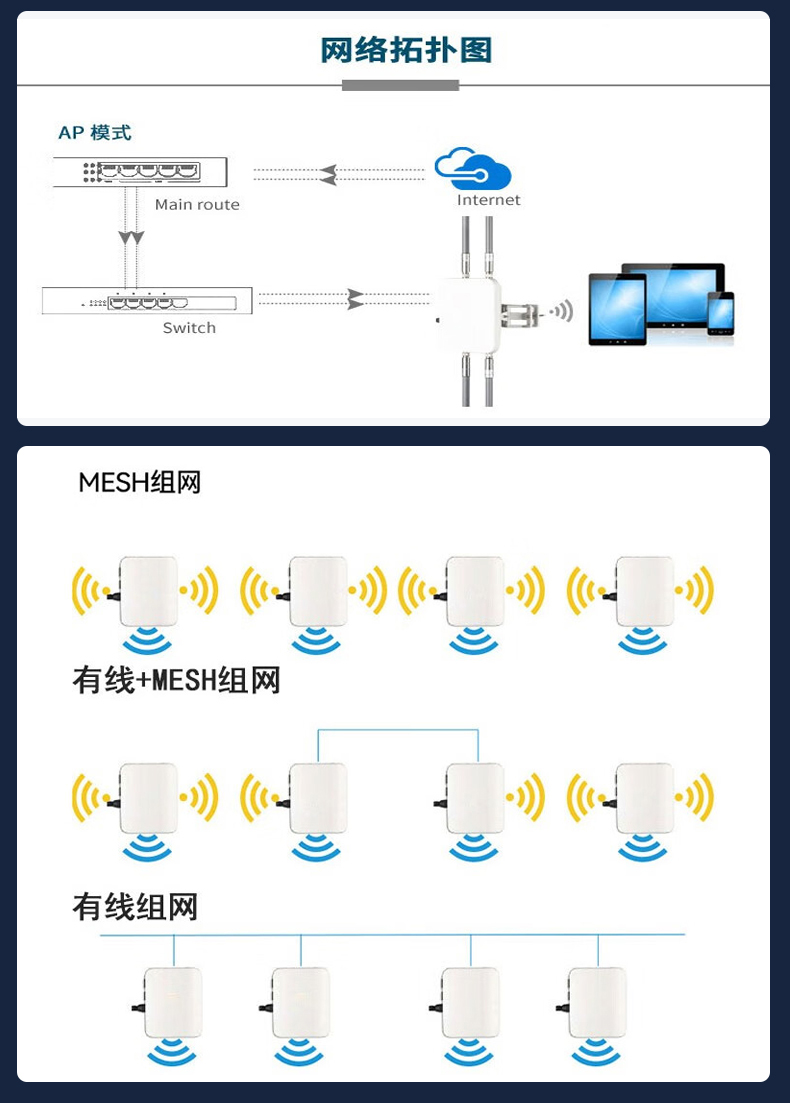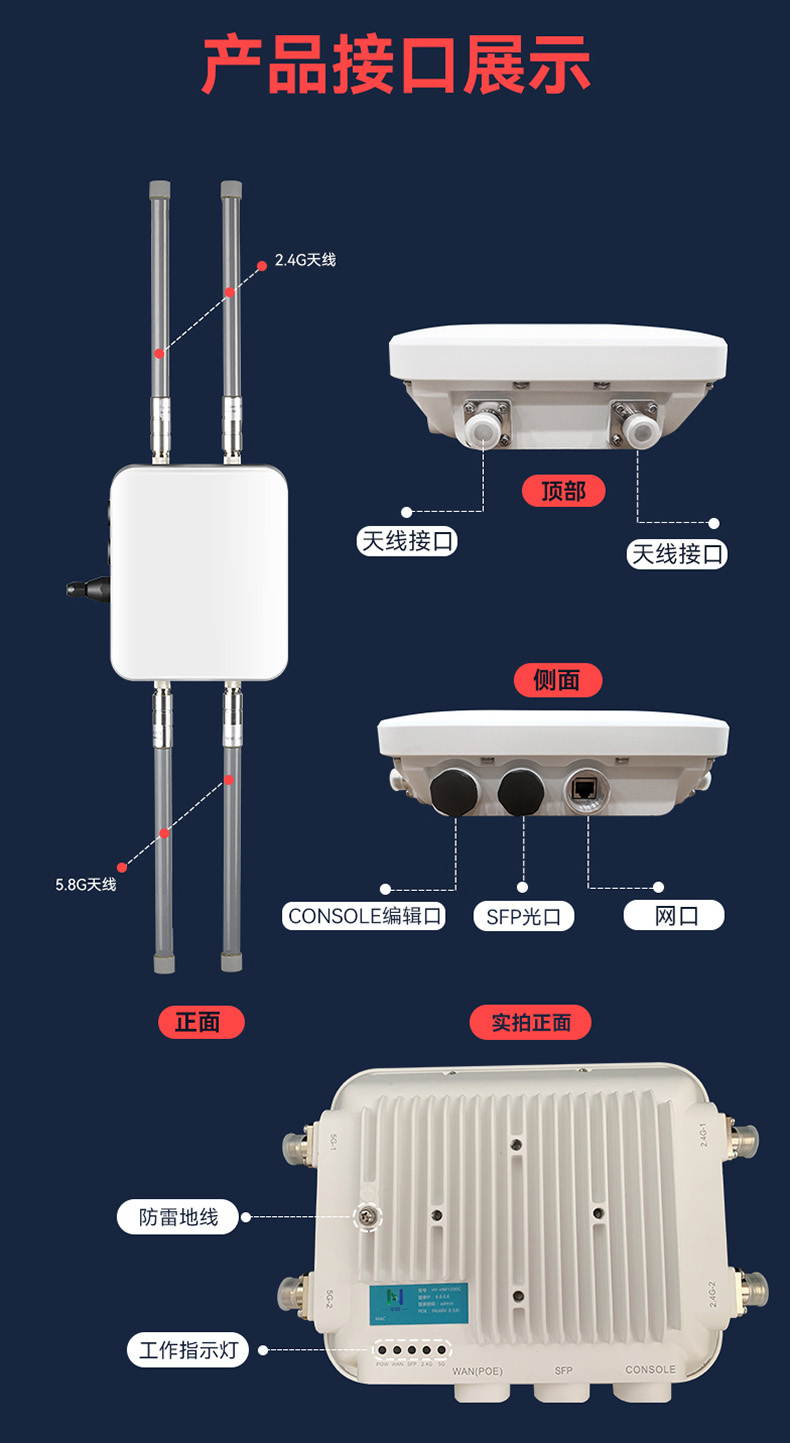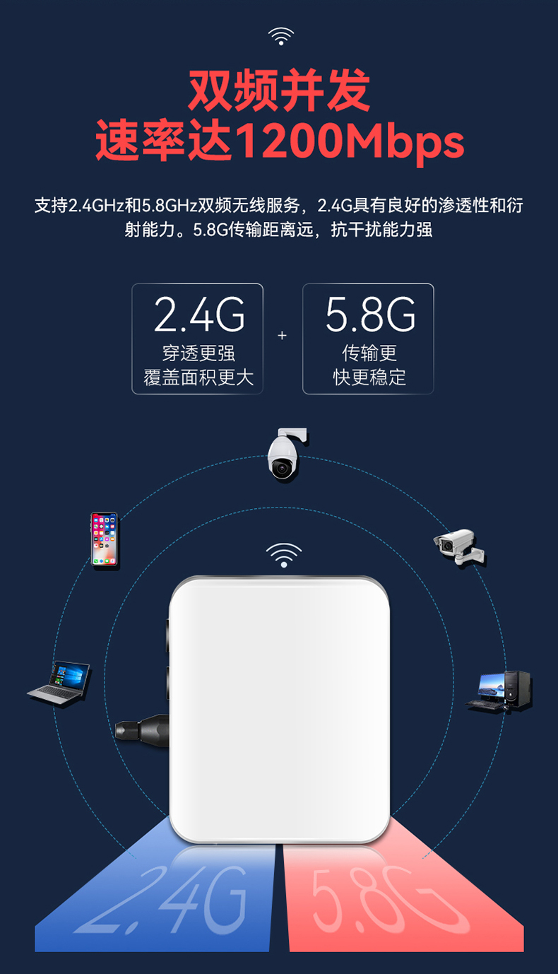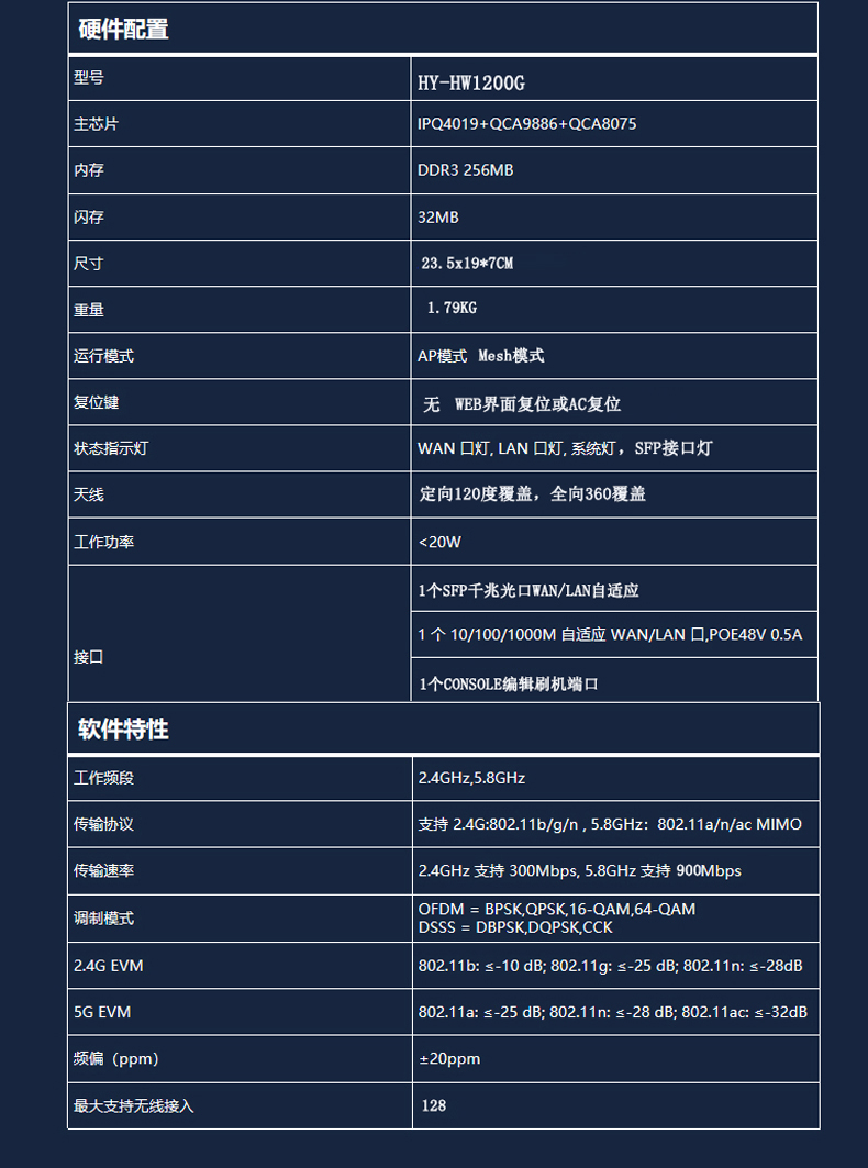 HY-HW1200G 是一款高性能, 高速率的户外型 1200Mbps 双频室外基站. 使用专业的工业级高通芯片, 可提供 2.4GHz 和双 5.8GHz 无线服务, 自带 1 个千兆 WAN/LAN 口, 1 个光口,无线速率可达 1200Mbps, 无线环境更干净,无线接入更稳定,无线接入用户更多,且无线速率更快,为景区、校园、智慧城市等人流密集型范围宽广环境的无线接入提供了很好的解决方案。此 PCB 板 2.4G 和 5G WIFI 分别配备 2 组独立信号放大器(PA)和 LNA,外置 8dbi 全向双极化筒状天线,无线覆盖半径可达 150-500左右 米,无线覆盖距离更远,穿墙能力更强;同时也支持智能信道分析和自动选择最优信道,减少干扰和延时,提供稳定的无线网络信号。