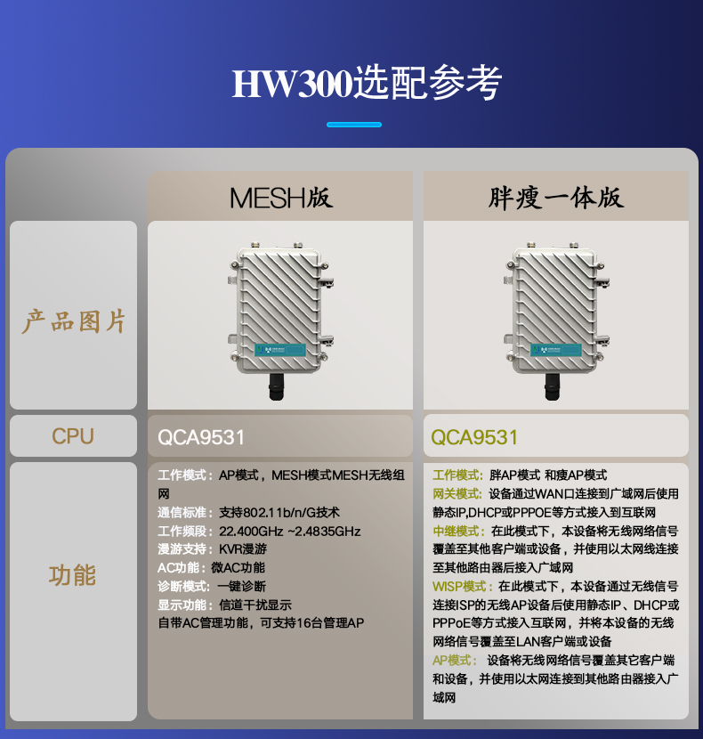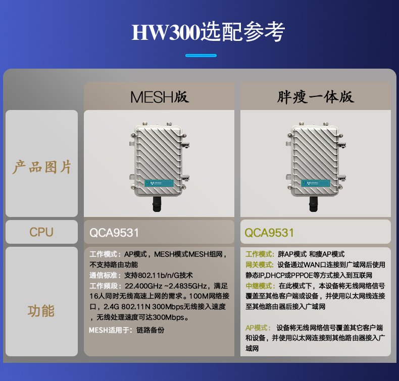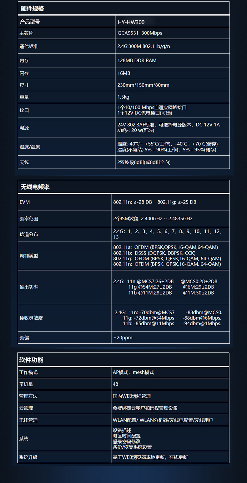 HY-HW300是一款高性能单频802.11b/g/n产品,可提供2.4GHz 最高300Mbps 的接入速率。
