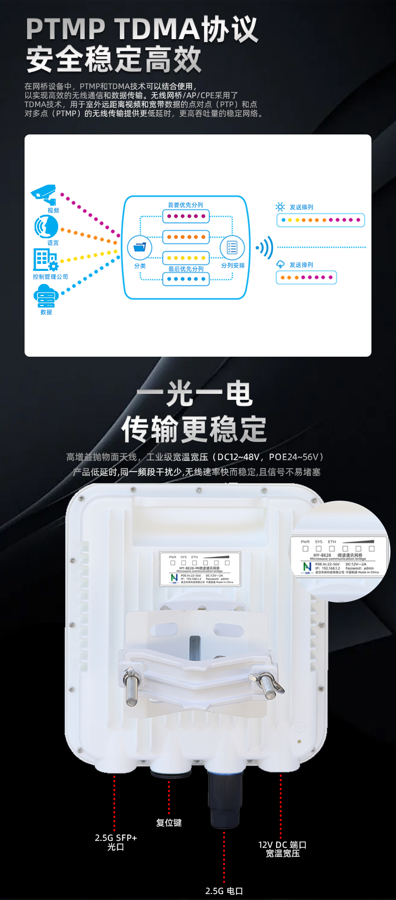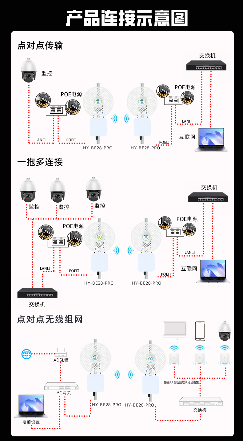 HY-BE28-PRO是一款高性能、高速率的室外远距离无线网桥,它具有传输距离远,穿透能力强,防干扰能力强等特点。