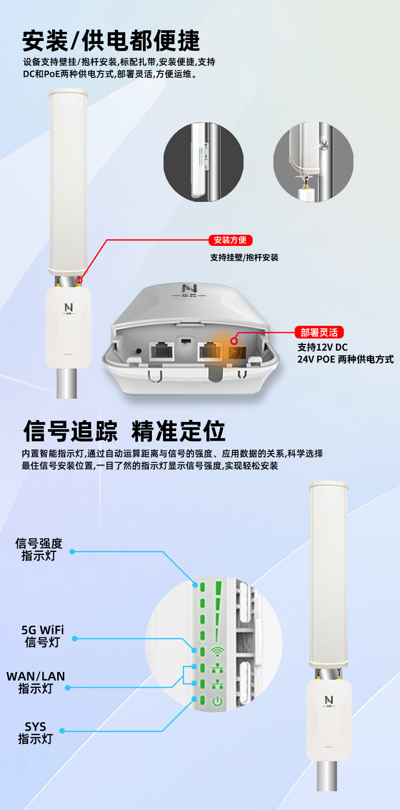 • 同时支持24~48V PoE供电和12V DC供电。