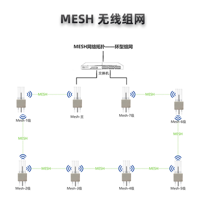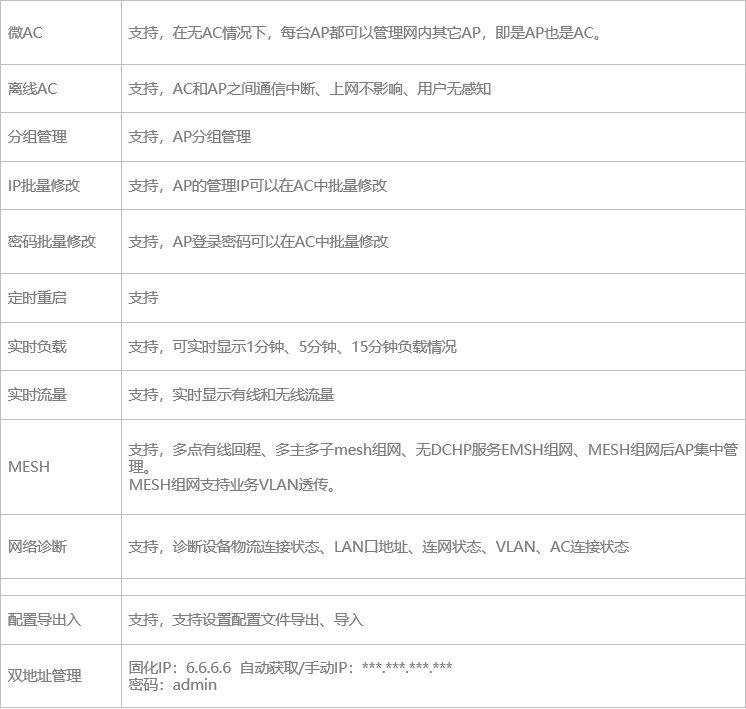 - 支持MESH组网(MESH支持VLAN透传),多点有线回传、无DHCP服务MESH组网、链路故障智能选路,MESH组网后AP支持AC集中管理。