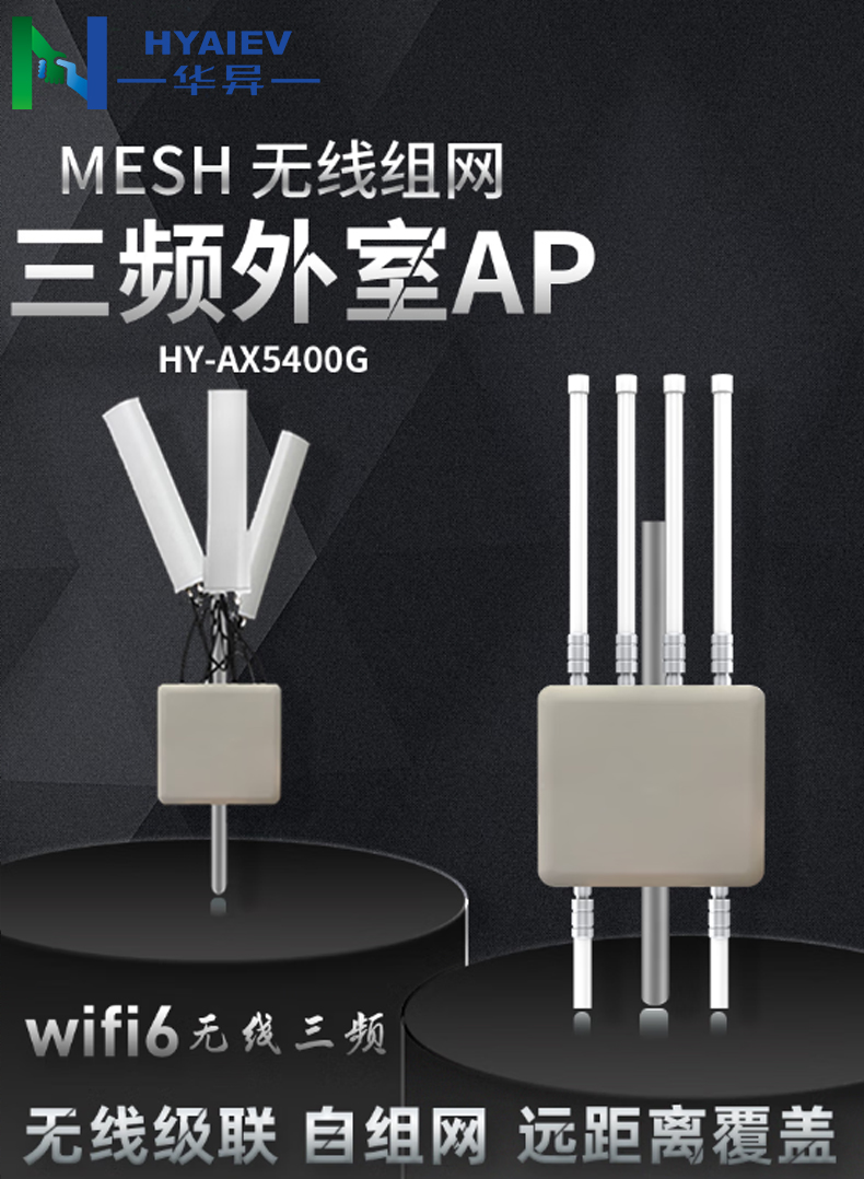 HY-AX5400G是华异面向商用室外场景推出的三频支持802.11ax的无线接入点(AP)产品,采用三射频技术,2.4G提供最高0.574Gbps的接入速率,5G-1提供最高2.402Gbps接入速率,5G-2提供最高2.402Gbps接入速率。整机最大可提供5.378Gbps的接入速率,高密度三频WiFi6接入设备。