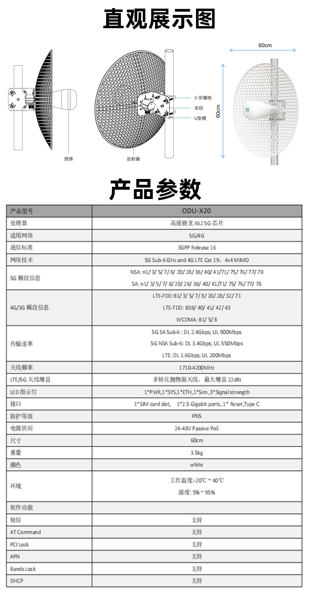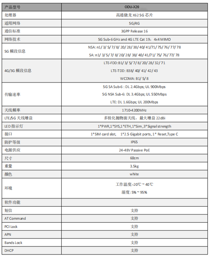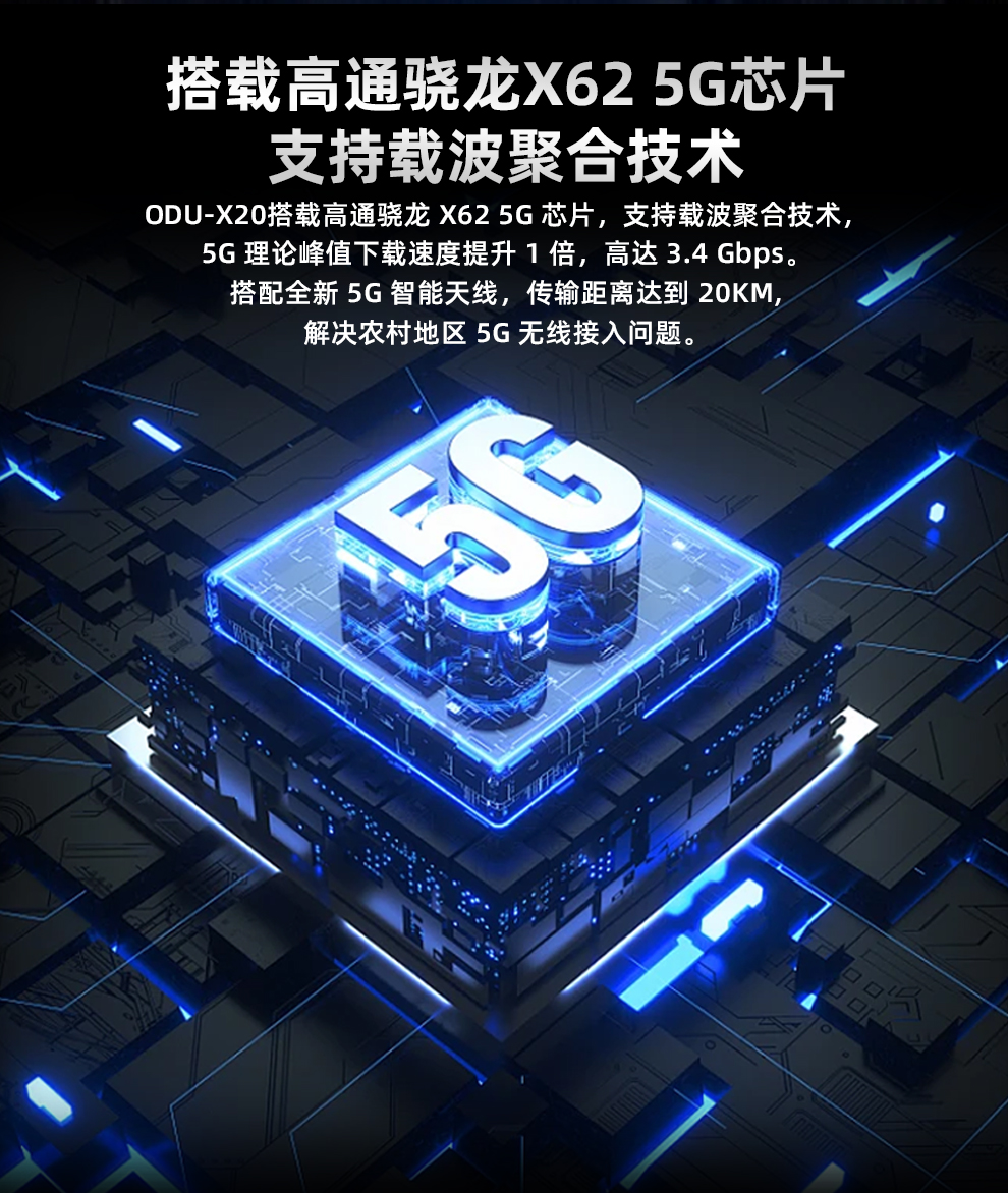 ODU-X20搭载高通骁龙 X62 5G 芯片,支持载波聚合技术,5G 理论峰值下载速度提升 1 倍,高达 3.4 Gbps。搭配全新 5G 智能天线,传输距离达到 20KM,解决农村地区 5G 无线接入问题。