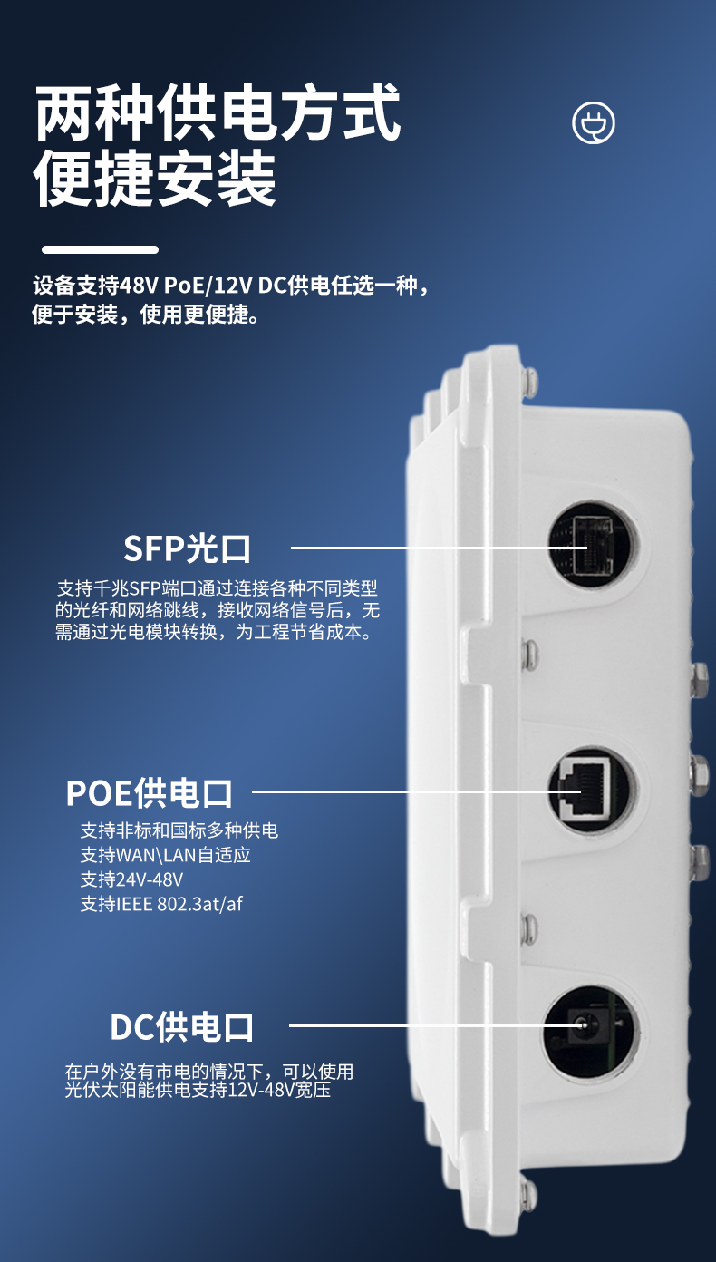 • 同时支持24~48V PoE供电和12V DC供电