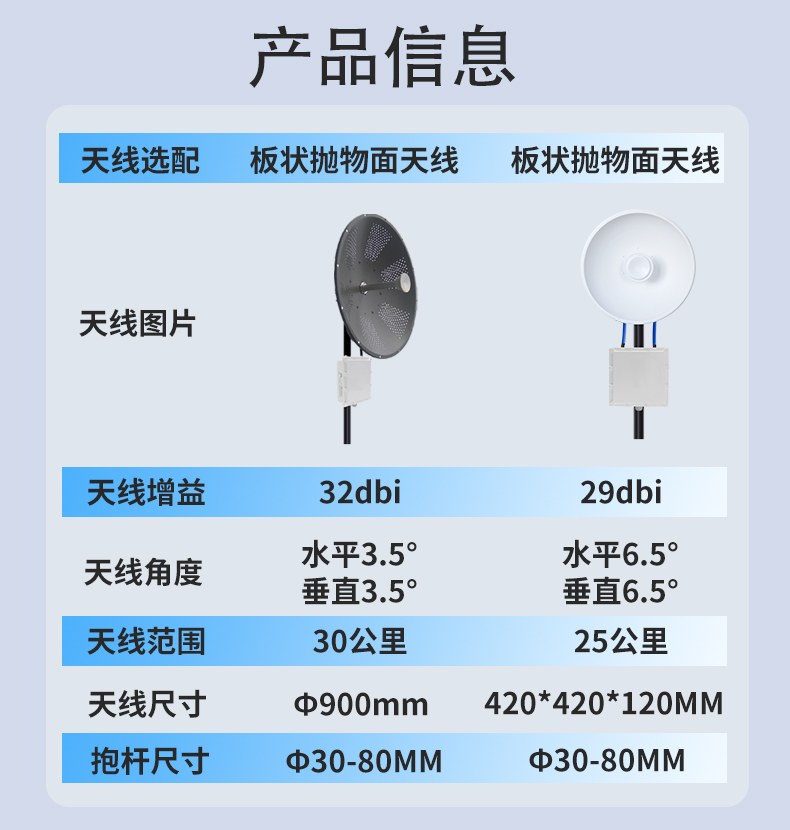 天线 | 外置碟型天线增益: 32dBi | ||||